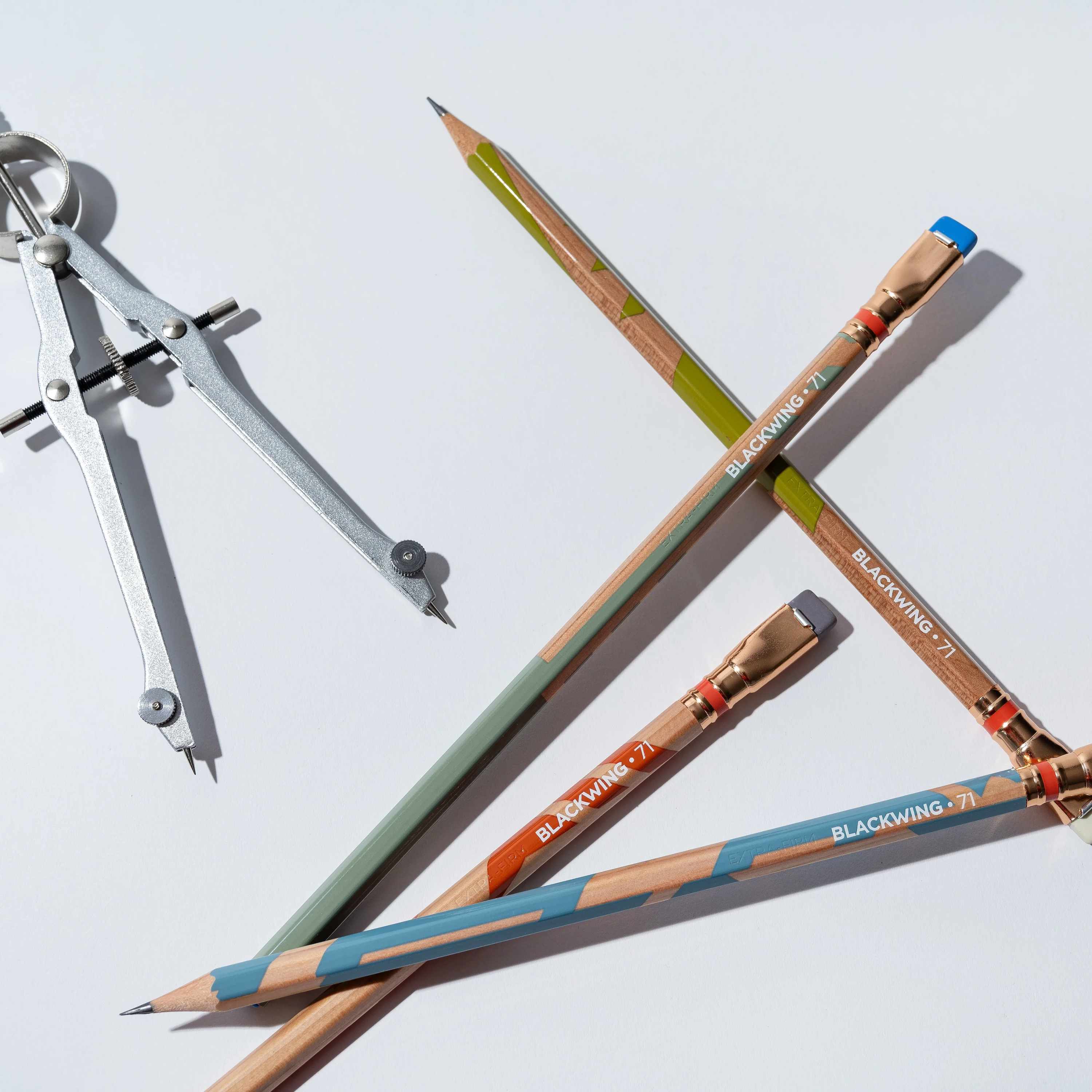 Neue Interpretation des legendären Künstler-Bleistiftes aus den 30er Jahren: spitzige Spitze vorne und rechteckige Metallfassung mit rechteckigem Radiergummi hinten – schützt vor dem Wegrollen!